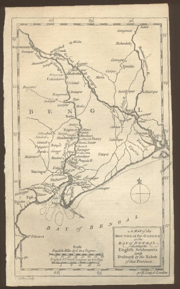 "A Map of the Mouths of the Ganges in the Bay of Bengal Shewing the English Settlements lately Destroy'd by the Nabob of that Province."