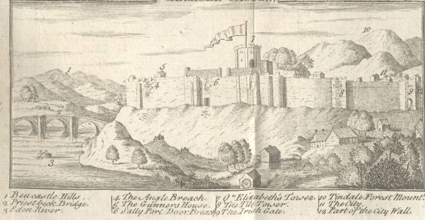 This historic map shows the course of the Second Jacobite Rebellion in the English and Scottish border area around Carlisle and its attempt to install Charles Edward Stuart (aka "Bonnie Prince Charlie" or "The Young Pretender") to the throne of England. The Pretender's forces succeeded in taking Carlisle Castle (built in 1062) and the view below shows some of the damage from the siege. The map shows where Bonnie Prince Charlie and his followers were camped and the course of their rebellion.