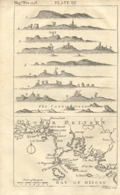 There are two parts to this sheet, a map of the Bay of Biscay and Lower Brittany and a scene labeled "The Cardinals" showing nine separate scenes of towns, windmills and assorted buildings on hills. The plate within the marked borders is 7 1/2 x 4 1/2 inches.