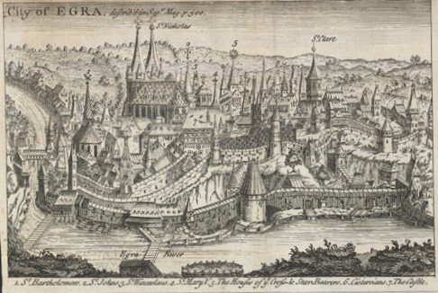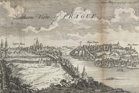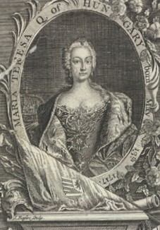 "A Plan of the City of Prague, with the French and Austrian Camps [on sheet with] City of Egra. Describ'd in Octr. Mag. P.530 [and] Southern View of Prague [and] Maria Teresa Q. of Hungary Born May 13th. 1717" This antique copper engraving includes a battle map of the Prague area (The War of the Austrian Succession, known in America as King George’s War), a birds-eye view of Prague, a birds-eye view of Egra and an engraving of the Queen of Hungary, Maria Teresa.
