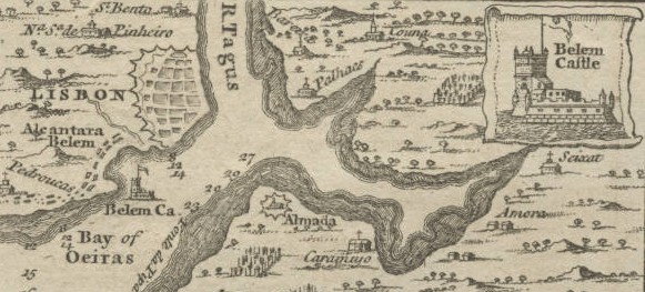 Two maps on one sheet with the upper being Spain and Portugal delineating the various provinces of Spain including Andalusia, Granada, Valencia, Catalonia and the islands of Majorca, Minorca and Ivica. The bottom map (shown below) shows the Mouth of the River Tagus or Harbour of the City of Lisbon with a small inset view of Belem Castle (see modern picture below).