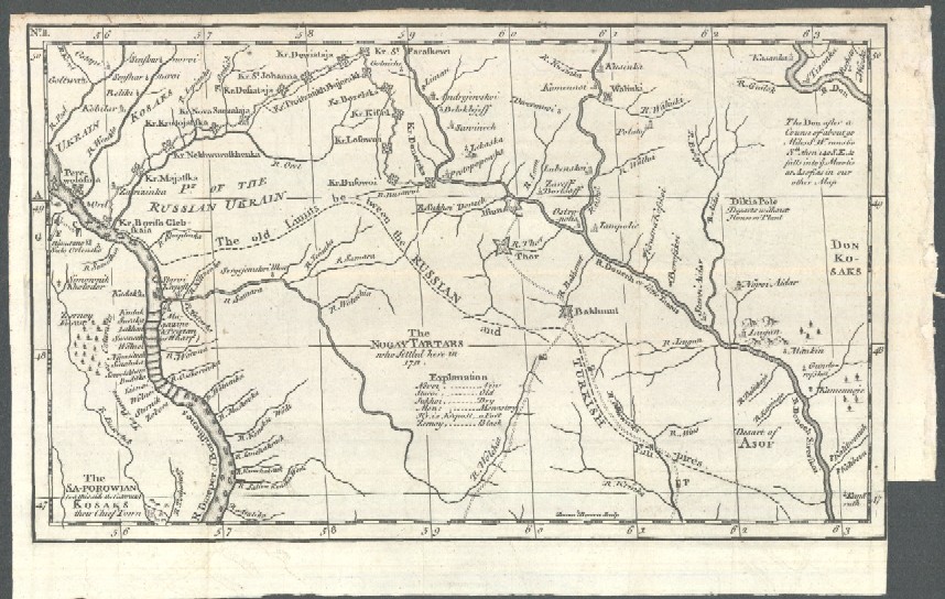 This old map shows the Ukraine, Dnieper River, Tartar and Don Kosak areas and boundaries of Russia and Turkey before the 1735-1739 Russo-Turkish War.