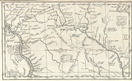 Map shows Ukraine, Dnieper River, Tartar and Don Kosak areas and boundaries of Russia and Turkey before 1735-1739 Russo-Turkish War