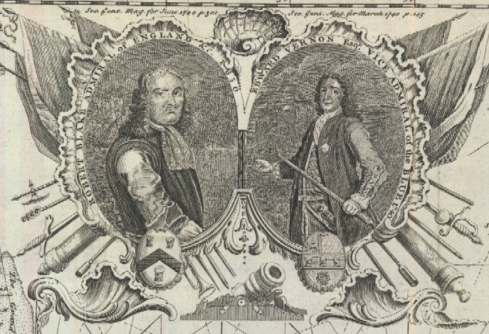 Below are enlarged views of the portraits of Admirals Blake & Vernon in medallions and the date of publication in small type.