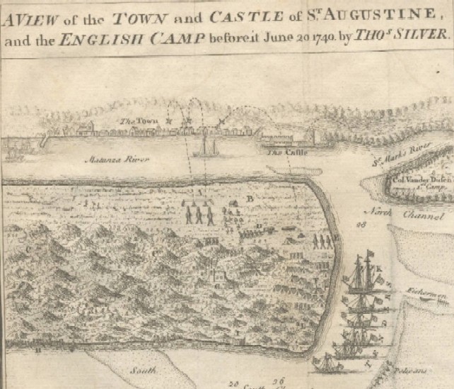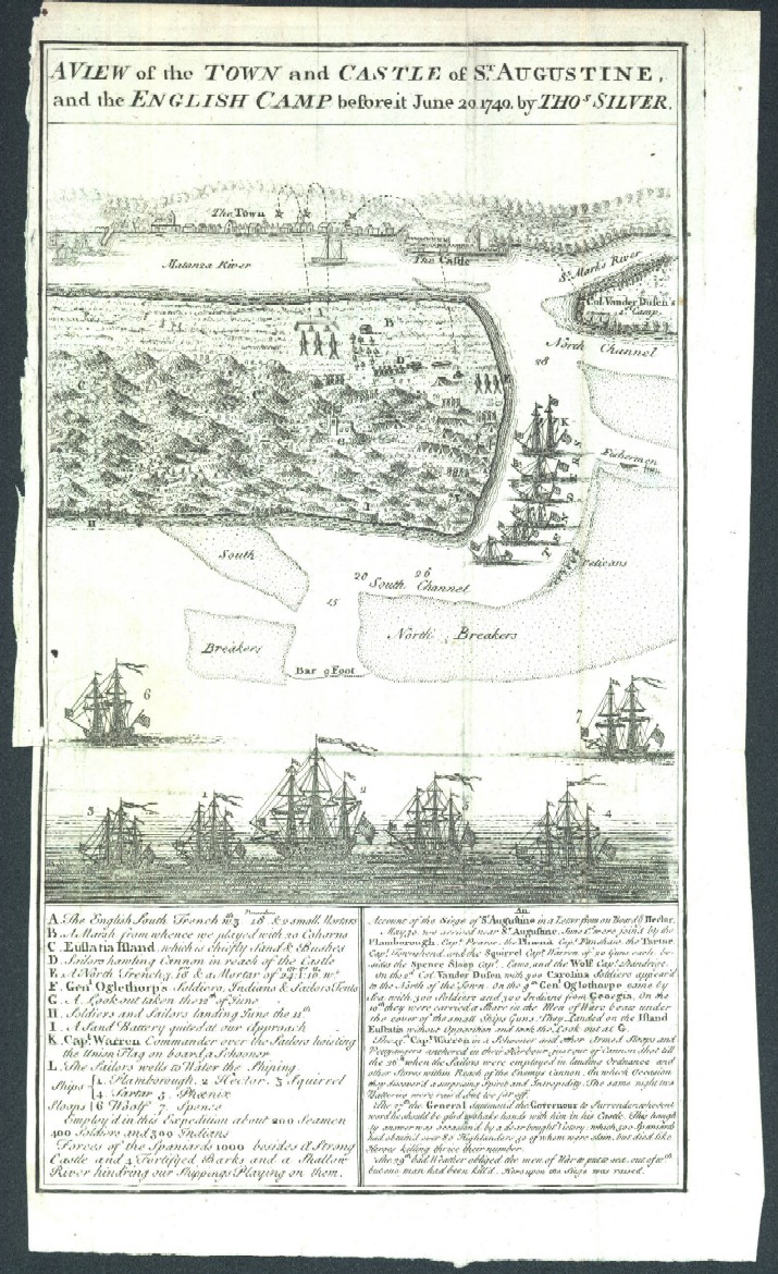 "A View of the Town and Castle of St. Augustine, and the English Camp before it June 20. 1740. By Thos. Silver" This is a great view of very early St. Augustine, then a Spanish possession, under siege by the English Navy. Lots of ships in view as well as the famous Castle and Town. The picture above was taken with a normal size scanner and comes closest to the actual color of the map and the one below of the entire view and description was taken with my large scanner with a bright light.