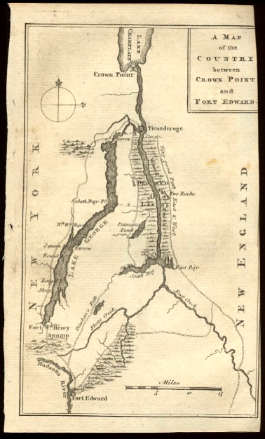 "A Map of the Country between Crown Point and Fort Edward" This map pictures the area Vermont and New York from Lake Champlain to the Hudson River. It is the site of the first military victory of Sir William Johnson, the Irish immigrant who became famous for his relations with the Iroquois and Mohawk Indians and his military victories during the French and Indian War. It also pictures the site of Fort William Henry where the French victory led to a massacre of civilians and military personnel by Indians that was pictured in the film "The Last of the Mohicans."