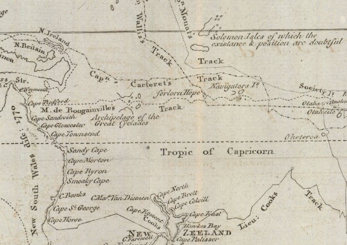 Three Maps Showing Captain Cook's Voyage Around The World "Chart of the Track of the Dolphin, Tamar, Swallow & Endeavor, through the South Seas; & the Track of M. Bougainville, round the World" Below is a close-up of the South Seas or Pacific Ocean map showing some of Cook's most important discoveries and see the reference doubts about the Solomon Islands ("Solomon Isles of which the existence & position are doubtful") and note the absence of any reference to Hawaii which Cook did not "discover" until a later voyage that started in 1776.