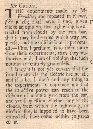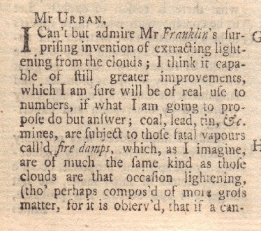 1752 Commentary on Benjamin Franklin's Lightning Rod Discovery One Skeptic and One Believer Comment on Franklin's Work and French Experiments In October 1752 when this issue of Gentleman's Monthly was published Benjamin Franklin's work on electricity was well know because of the May 1750 Gentleman's Magazine article on his discovery of the lightning rod and the 1751 pamphlet published by Edward Cave and translated into many languages (“EXPERIMENTS AND OBSERVATIONS ON ELECTRICITY, MADE AT PHILADELPHIA IN AMERICA, BY MR. BENJAMIN FRANKLIN, AND COMMUNICATED IN SEVERAL LETTERS TO MR. P. COLLINSON, ESQ; OF LONDON, F.R.S.”). Of particular note was the French enthusiasm for Franklin's work which led to the confirmation of his hypothesis. At this time, Franklin's kite experiment with electricity was unknown. The French experiments based on Franklin's work is the subject of the first letter in this issue and the second requests the extension of Franklin's experiments into other areas of inquiry to prevent the explosion of coal gasses in mines and similar mining maladies called "damps in mines." The first article is signed in type by Sunderlandensis who is a clear skeptic of Franklin's work and the French experiments and the second letter, by an admirer of Franklin's work is signed in type by W.C. from Yorkshire. Below are pictures of the start of each of those letters.