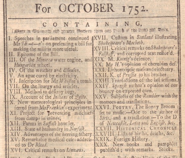 As shown from the index above there were other scientific articles in this issue, a long article on the customs of the Indians of Quito, Ecuador as well as articles on Shakespeare. There is only one plate, a copper engraving of a Minorca water engine and a Hungarian wheel.