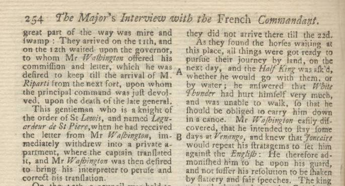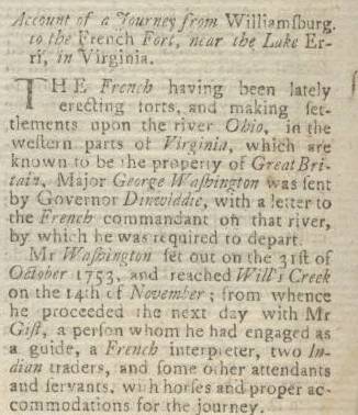 First International Newspaper Mention of George Washington in June 1754 Major George Washington's First First Military Expedition to Request French to Abandon Fort Duquesne (Pittsburgh) Extensive report of expedition from Williamsburg, VA to Ohio River