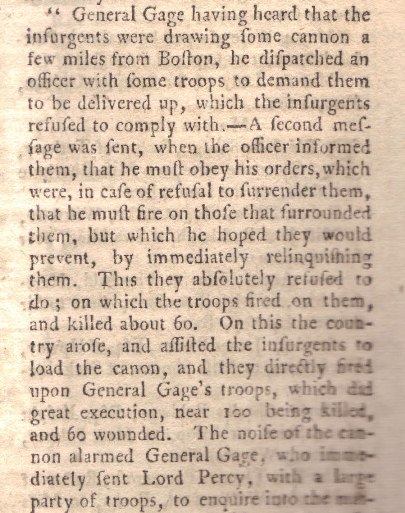 The Battles of Lexington and Concord "Shot Heard Round the World" First Report of the Skirmish Delivered to British Public in May 1775 British Try to Prevent Continental Congress From Meeting and Declare America in Rebellion The highlight of this May 1775 issue of Gentleman's Magazine is an amazingly quick account of the April 19, 1775 battle between British troops and American militia at Lexington and Concord, about 15 miles from Boston, Massachusetts. The trade-off with the news reaching across the Atlantic so quickly is that the report is inaccurate and overstates the number of troops killed on both sides. There is much more in this issue concerning the conflict between the British and Americans, including the full text of a letter to royal governors in America instructing them to prevent assemblies from choosing delegates to the Second Continental Congress, with a report on its ineffectual result. The issue also includes an extensive account of the debate in Parliament on a response to King George III's address in which he declared the American colonies "in rebellion" and pledged his wealth and honor to the suppression of the rebellion. Pictured below are some excerpts from his historic issue. Below is some of the preliminary report of the battles of Lexington and Concord.