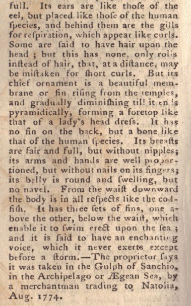 Below is an copper engraved plate included in this issue. The most intriguing part of the engraving is the picture of a mermaid, which were still believed to exist in 1775. The text that follows includes a description of the mermaid and the location in which it was caught.