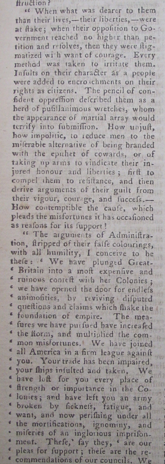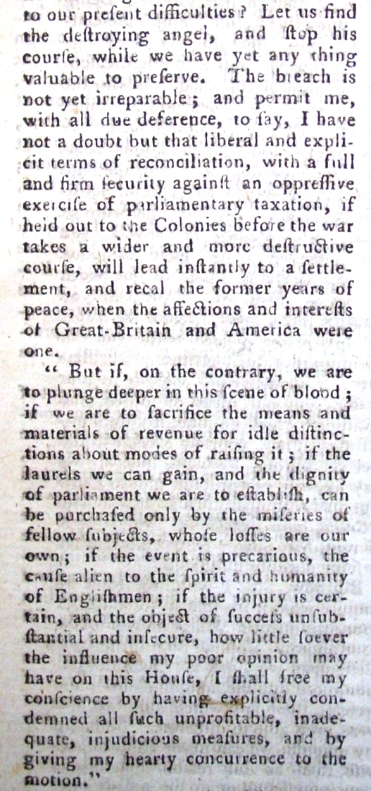 Below are excepts from the debates in Parliament included in the August 1776 issue, with many eloquent expressions of opposition to the British actions toward America.