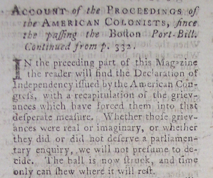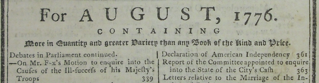 August 1776 Publication of Declaration of Independence Very Early Publication of Foundation Document of American History Includes "Proceedings in the American Colonies" Regarding Independence Movement and Debates in Parliament regarding British Attempts to Suppress Rebellion Reviews Gibbon's "History of the Rise and Fall of the Roman Empire"