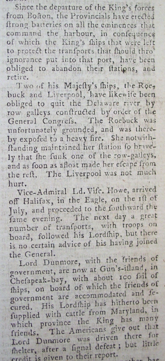 The magazine gives an account of what was happening from Boston to Virginia and the status of British naval forces in America.