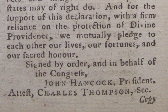 Below is the start of the Declaration followed by its end with the signature of John Hancock noted.