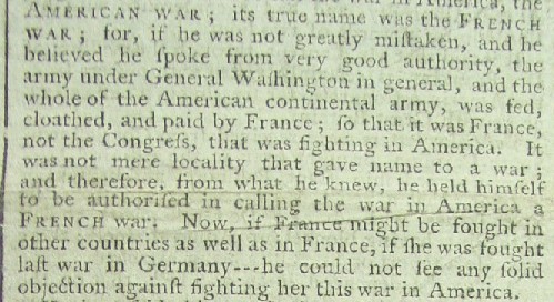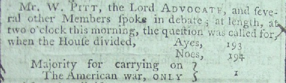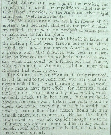 The excerpt from the debate below contains the contributions of four members of Parliament, two on each side of the question. It includes a member supporting the resolution who succinctly rebuts the argument that the war in America is against France by stating that if true it means 3,400 French soldiers were defeating 73,000 British troops, a conclusion which any loyal British citizen must refuse to accept.