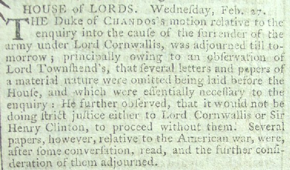 In addition to the debate and vote to end the Revolutionary War, the newspaper also references the battle which brought them to the debate and vote, the defeat of General Charles Cornwallis at Yorktown with meager assistance from General Henry Clinton, the Commander in Chief of his Majesty's Forces in North America. That defeat was an obvious shock to the British public who was led to believe their troops were invincible, so the recriminations and investigations naturally followed. Below a news article notes the "enquiry into the cause of the surrender of the army under Lord Cornwallis" which was then being conducted by the House of Lords.