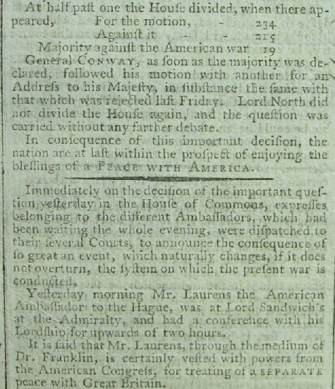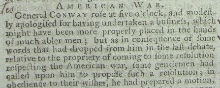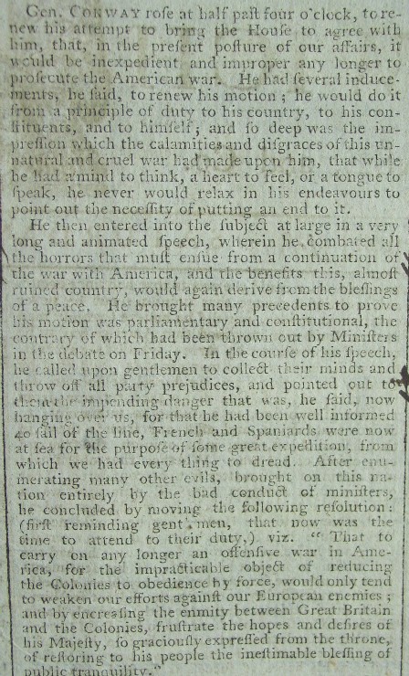 Below are excerpts from the front page of the newspaper which over three-quarters of which is taken up with the debate on the resolution to end the "American War," which is known here as the Revolutionary War. It starts with General Conway introducing his resolution to end the war and his argument for his resolution.