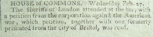 The resolution to end the war was renewed in the middle of the next week, this time at the behest of the "Sheriffs of London" together with the earlier petition from the City of Bristol, both commercial centers that were harmed by the war in America.
