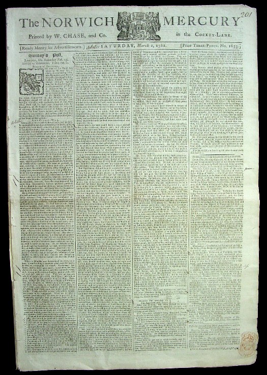 "In consequence of this important decision, the nation are at last within the prospect of enjoying the blessings of a PEACE WITH AMERICA" Thus ends the lengthy newspaper report of two debates and votes in the House of Commons which effectively ended the Revolutionary War and granted Independence to America. This very rare and historic newspaper has the fullest and most complete treatment available of the most important political event that directly led to American Independence. As noted in the last excerpt pictured above, discussions of peace and independence began immediately after the vote with the former President of Congress, Henry Laurens, who was in London at the time and was then the American Ambassador to Holland. And there was speculation that "Mr. Laurens, though the medium of Dr. Franklin, is certainly vested with powers from the American Congress, for treating of a SEPARATE peace with Great Britain." In fact Ben Franklin, John Adams and John Jay, the American Peace Commissioners, were not authorized to conclude a separate peace with England, but that is what they did anyway. The sequence of events, starting with the debate and vote recorded in this newspaper, are as follows: February 27, 1782 - House of Commons votes against further war in America. March 5, 1782 - The British Parliament empowers the King to negotiate peace with the United States. March 20, 1782 - British Prime Minister, Lord North, resigns, succeeded two days later by Lord Rockingham who seeks immediate negotiations with the American peace commissioners. April 4, 1782 - Sir Guy Carleton becomes the new commander of British forces in America, replacing Gen. Clinton. Carleton will implement the new British policy of ending hostilities and withdraw British troops from America. April 12, 1782 - Peace talks begin in Paris between Ben Franklin and Richard Oswald of Britain. April 19, 1782 - The Dutch recognize the United States of America as a result of negotiations conducted in the Netherlands by John Adams. June 11, 1782 - The British evacuate Savannah, Georgia. August 27, 1782 - The last fighting of the Revolutionary War between Americans and British occurs with a skirmish in South Carolina along the Combahee River. November 30, 1782 - A preliminary peace treaty is signed in Paris. Terms include recognition of American independence and the boundaries of the United States, along with British withdrawal from America. December 14, 1782 - The British evacuate Charleston, South Carolina. January 20, 1783 - England signs a preliminary peace treaty with France and Spain. February 3, 1783 -The Treaty of Paris is signed by Ben Franklin, John Jay and John Adams and Spain recognizes the United States of America, followed later by Sweden, Denmark and Russia. February 4, 1783 - England officially declares an end to hostilities in America. April 11, 1783 - Congress officially declares an end to the Revolutionary War. Below are close-up of the newspapers masthead and red tax stamp on the front page.