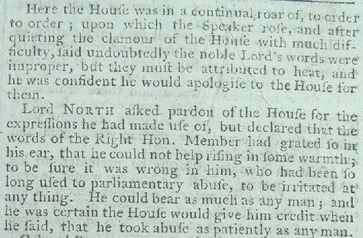 Immediately after the vote, which was recognized as momentous on both sides, the contenders continued a verbal battle which resulted in Prime Minister North losing his composure which resulted in chaos and disorder in the house. Below the text catches the flavor of the uproar and the begrudging apology of Lord North.