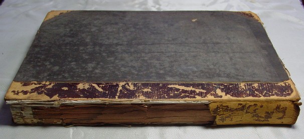 cover is held on by what remains of the leather spine. A child wrote on the