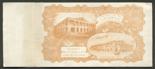 The Democratic Party faced a dilemma in 1900 with prosperity and a popular incumbent President in William McKinley. They chose is to go again with their candidate of 1896, the charismatic populist William Jennings Bryan. This ticket would have gotten you in to the convention hall in Kansas City to witness the drama and festivities. The ticket pictures Thomas Jefferson and an American Flag on the front and sepia toned pictures of the Kansas City convention hall before and after reconstruction. The ticket is thin and enclosed in a hard plastic sleve to protect its delicacy and there have been repairs to the ticket, most notably archival tape holding the stub to the ticket. The enlarged pictures of the front and back give a good reflection of the condition, which is good for such a thin paper historical artifact. Price: $85/SOLD |