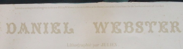 Being from New England and an historical print collector I have seen a lot of Daniel Webster prints, but this is the most compelling portrait of the great man that I have ever seen. This print was published in New York by Schaus but the lithography was done by Julien in the offices of Francois Delarue on rue J. J. Rousseau in Paris, which probably explains the unique look of this print. We could find no other copies of this print on the web or in other print reference works Below is the title of the print, with the date in the small print and the reference to the lithographer JULIEN.