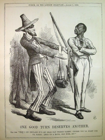 who, here garbed as Uncle Sam, hands a musket and cartridge box to Sambo, saying