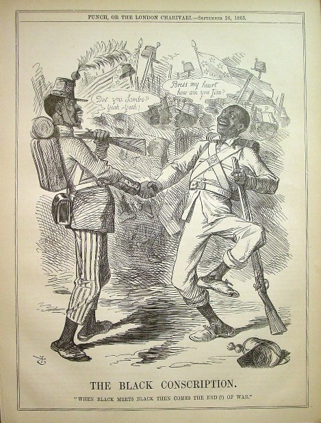 This cartoon by John Tenniel pictures a joyous reunion of Black troops from the North and South with the Union soldier on the left saying "Dat you Sambo? Yeah, Yeah!" and the Confederate soldier stepping high with a big smile saying "Bress by heart how am you Jim?" Tenniel has obviously mastered African-American Vernacular English, also called Ebonics or Jive. The apparent theme of the cartoon is that the natural bonds among Blacks and their convivial nature is such that when they became a large part of the competing armies that the Civil War would stop. The Emancipation Proclamation became effective on January 1, 1863 and after the victory at Vicksburg large scale recruitment of blacks into the Union army commenced, but the Confederate Army still did not allow Black soldiers at the time the cartoon was published, so Tenniel was a bit premature in his hope for a happy conclusion to the war. When the South out of desperation became serious about recruitment of Blacks into their armies in 1865 it was too late to help or hasten the end of the war.