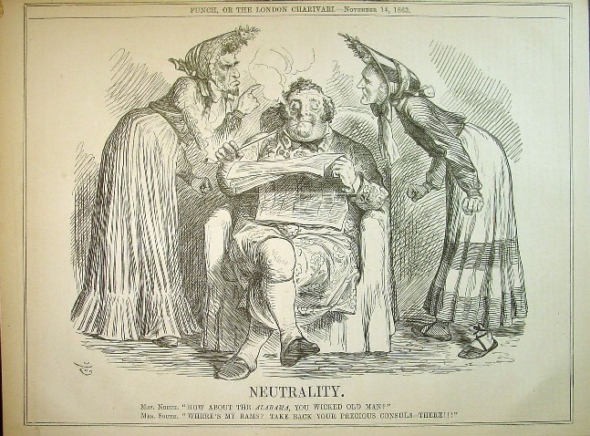 Davis, as Mrs. South: “Where’s my rams? Take back your precious consuls— there!” British neutrality in November, 1863, so far as it affected the Union cause, was of a sort that in the end was to afford John Bull little reason for the complacent mood in which Tenniel pictures him. The Confederate cruiser Alabama, built, equipped and coaled at Liverpool, was permitted to sail from that post on July 29, 1862, despite vigorous protests and efforts on the part of our minister in London to prevent it, and before its destruction by the Kearsarge off the French coast in mid-June, 1864, looted and sank many million dollars worth of American shipping. Not a few Englishmen refused to condone the ravages of the Alabama, and their anger found impressive expression in April, 1863, at a great meeting held in Manchester “to protest against the building and fitting-out of piratical ships in support of the Southern Slave-holders’ Confederacy.” The principal speaker at this meeting was Goldwin Smith, then a professor at Oxford, and never did that champion of justice deliver an address that in after years gave him a fuller measure of satisfaction. “The duties of nations toward each other,’’ he declared, ‘‘are not bound by the technical rules of law. They are as wide as the rules of morality and honor; and if in our dealings with America we violate the rules of morality and honor, we must abide the consequences of wrong doing, though our lawyers may advise us that we are secure. No nation ever inflicted upon another a more flagrant or maddening wrong. No nation with English blood in its veins has ever borne such a wrong without resentment. Built and equipped in a British port, manned by British seamen, with the English flag flying, the Alabama went forth to cruise from an English port against the commerce of our allies. That is the substantial grievance of the American government, and no technicalities can make it other than a heinous wrong.” When ten years later the British government paid without dispute the fifteen and a half million award of the Alabama Claims Tribunal it afforded tacit yet ample confession that Goldwin Smith’s protest in 1863 had been a needed and righteous one.