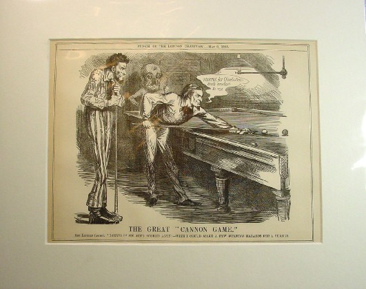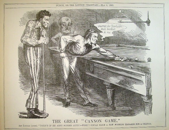 This is a nice engraving by John Tenniel of Abraham Lincoln dressed as Uncle Sam playing pool with Jefferson Davis who is getting the better of him. But as Wilson point out in his commentary on this cartoon below, the cartoon was published on the eve of the great Union victories at Gettysburg and Vicksburg in early July, 1863. From Lincoln in Caricature by Rufus Rockwell Wilson The cartoon by Tenniel, The Great “Cannon Game,” appeared in London Punch on May 9, 1863—the eve, one recalls with a smile, of the decisive Union victories at Gettysburg and Vicksburg. The same issue of Punch contained an article entitled The Great American Billiard Match which, without design on the part of its author, but with a like blindness to the events of the morrow, affords an appropriate footnote to Tenniel’s drawing. ‘‘Considerable excitement,’’ we are told, ‘has been caused in sporting circles by this long protracted match . . . no one now dare prophesy when it will he finished. As for old Abe Lincoln, the champion player of the North, his hackers, we believe, are as confident as ever that he is the best man, although at times his play has not appeared to prove it. There is no doubt that he has more strength at his command, but strength is of small use without knowing how to use it. Abe Lincoln may have skill, but he has not shown much of it, and certainly he more than once has shown himself outgeneraled.” “How the game will end we won’t pretend to prophesy. There are plenty of good judges, who still appear inclined to bet in favor of the South and longish odds are offered that the game will be a drawn one. Abe’s attempt to pot the niggers some put down as a foul stroke, but whether foul or not, it added little to his score. Upon the whole we think his play has not been much admired, although his backers have been vehement in superlatively praising it. There is more sympathy for the South, as being the weaker side—a fact which Jeff’s supporters indignantly deny, and which certainly the North has not done much as yet toward proving. Without ourselves inclining one way or the other, we may express a neutral hope that the best player may win; and we certainly shall echo the desire of all who watch the game if we add that the sooner it is now played out the better.”