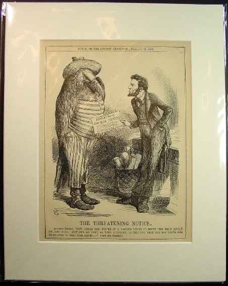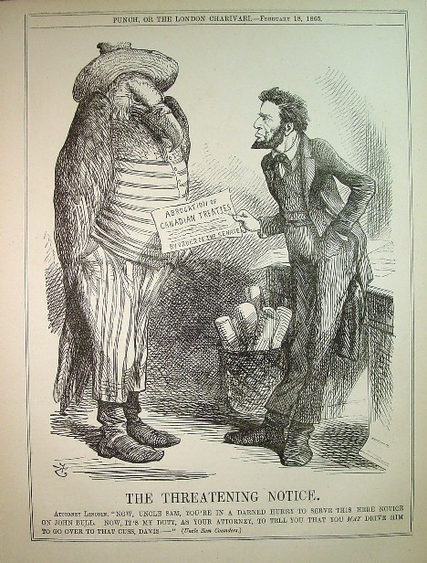Lincoln In Caricature by Rufus Rockwell Wilson The cartoon, The Threatening Notice, appeared in London Punch on February 18, 1865, when Tenniel caricatured the living Lincoln for the last time. It represents the President remonstrating with the American eagle in the dress of Uncle Sam over the Senate’s proposed abrogation of Canadian treaties. “Now, Uncle Sam,” Mr. Lincoln is reported as saying, ‘you are in a darned hurry to serve this notice on John Bull. Now, it is my duty, as your attorney, to tell you that you may drive him over to that cuss, Davis.” But John Bull was not to be driven “over to that cuss, Davis.” Two months later the war was ended, Mr. Lincoln dead, and Mr. Davis in flight from what proved early capture by Union troopers.