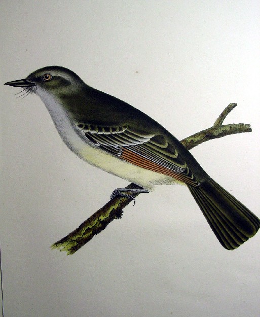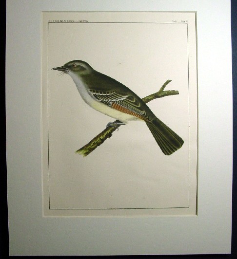1850s Hand Colored Stone Lithographs of Birds of the West Ash-throated Flycatcher