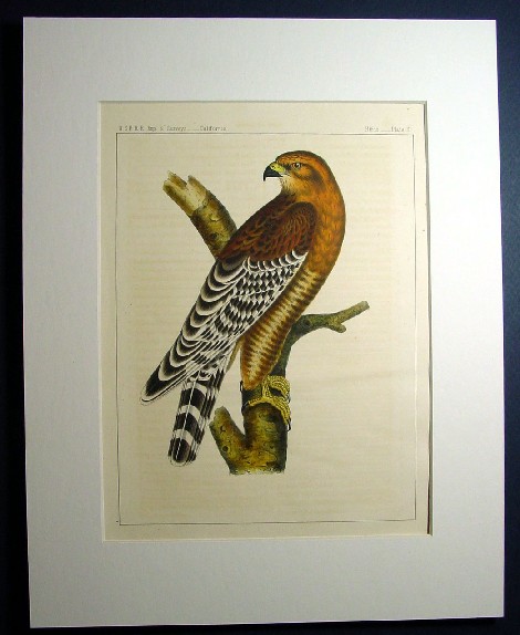 1850s Hand Colored Stone Lithographs of Birds of the West Red-shouldered Hawk