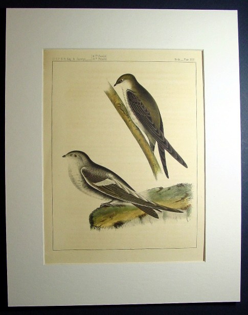 This plate shows a pair of White-throated Swifts, Panyptila melanoleuca. On the upper margin of the print it says "U.S.P.R.R. Exp. & Surveys --- 47th Parallel, 35th Parallel" and "Birds - Plate XVIII." The description of the birds from the report of the expedition and survey says these birds were found on February 16, 1854 at Bill Williams' Fork, New Mexico. It notes that "In its flight and habits ...it closely resembles the common chimney swift, (Chaetura pelasgia) Below is the lithograph as it will come to you matted and in a protective clear plastic sleeve.