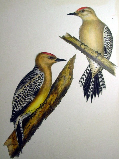 1850s Hand Colored Stone Lithographs of Birds of the West Gila Woodpecker