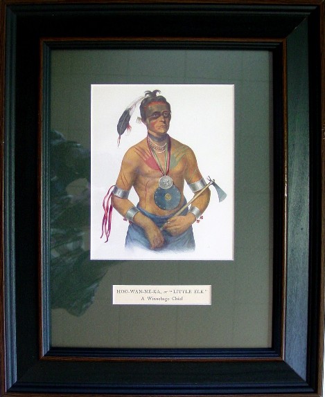 This is one of our favorite Indian prints showing a colorful and strong man in full dress regalia that is nicely matted and framed in complementary colors. It also comes with the full biography of HOOWANNEKA from "The Indian Tribes of North America" as shown below.