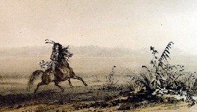 Original 1850s Native American Indian Prints "Reports of Explorations and Surveys to Ascertain the Most Practicable and Economical Route for a Railroad from the Mississippi River to the Pacific Ocean." Below is our inventory of Indian prints from the famous 1850s U. S. government survey headed by Secretary of War Jefferson Davis to determine the best route for the first transcontinental railway. The railroad was not completed until 1867 because of political conflicts, including the Civil War, which Davis played a major role in as President of the Confederate States of America. With the exception of the first one shown below they are all color lithographs and they are all matted to a standard frame size of 11 x 14 inches so you do not have to get an expensive custom frame to properly display these prints. Click on the pictures or titles below to get more information on each of these prints. The Romantic Vision of Indian With Spectacular View The Tribes of Mojaves, Navajos and Zunis
