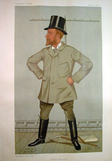 Standing with his hands on hips, a cane and manuscript of one of his famous plays on the stage, Sir Leslie Ward has playwright Henry Arthur Jones striking a jaunty pose in the Vanity Fair portrait published in 1892. The biography of Jones by Jehu Junior published with the print, a copy of which is included, notes the humble upbringing and limited education of Jones did not deter Jones from becoming a successful writer and producer of plays: