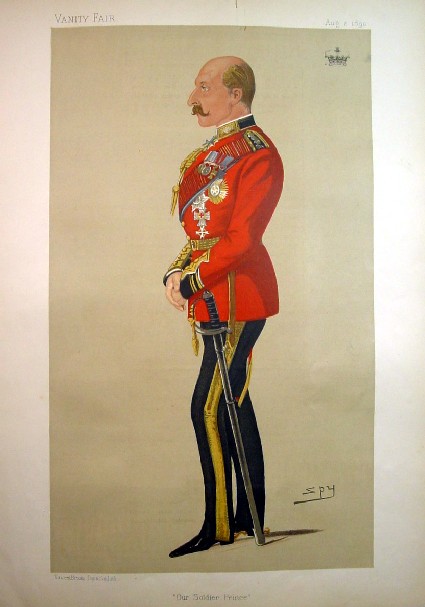 This original 1890 Vanity Fair print by Sir Leslie Ward (signed as "Spy") is of Prince Arthur William Patrick Albert, Duke of Connaught and Strathearn. You can see the royal symbol in the top right corner of the print for this son of Queen Victoria who after his military service became the Governor General of Canada from 1911 to 1916. The biography by Jehu Junior originally published in 1890, a partial copy of which is included with this print, notes the prince's titles, pedigree and military service:
