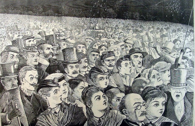 This July 1868 engraving was taken while Winslow Homer was residing in New York City and was probably of a scene in the city the evening of July 4th as the title suggests. It is one of the few Homer crowd scenes (See also, New England Factory Life -"Bell-Time") and his artistry is best seen close up, as shown by the picture below which captures the bottom right corner of the engraving. Notice the man in the top hat with the rocket striking his top hat and pushing it over his eyes. See the range of emotions on the faces of the people. If you look closely you can see Homer signing the engraving with his initials on the man's coat.