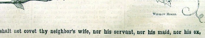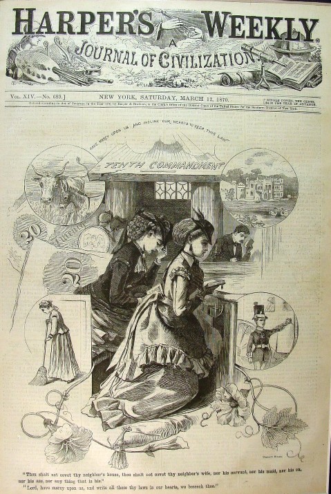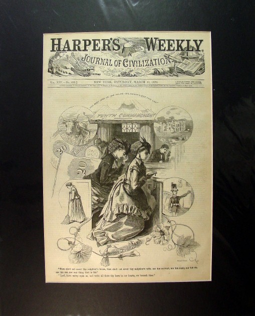 Winslow Homer 1870 Matted Wood Engraving "The Tenth Commandment" This cover page from the March 12, 1870 Harper's Weekly has Winslow Homer's illustration of the teachings of the Tenth Commandment and picturing all the things we are not supposed to covet by the mandate of the Commandment, (wives, money, property, oxen and asses, etc.). The center of the graphic as two lovely ladies kneeling in church praying and to the side is a guy kneeling and what looks like a covetous look on his face. This engraving has Winslow Homer signing in type, something I have not seen on any of his other engravings.