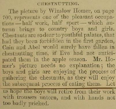 This lovely print appeared in the October 29, 1870 issue of Every Saturday and captures a fall scene typical of Winslow Homer's classic genre prints. Below is the text that accompanied the print on the date of publication which will be included on the back of the framed print. Also pictured below is the left corner of the print with Homer's signature.