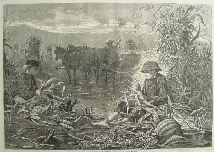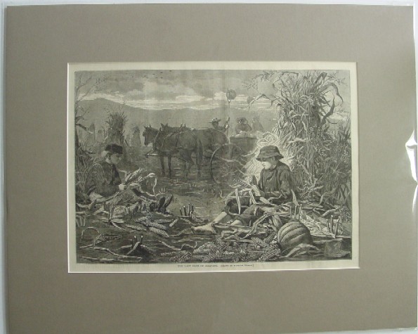 1873 Winslow Homer Wood Engraving "The Last Days of Harvest" The wonderful late summer to early fall scene drawn by Winslow Homer in 1873 pictures two boys in the foreground shucking corn and in the background two men using pitchforks to load pumpkins on a horse drawn wagon. Philip Beam in his book on Homer's periodical engravings notes that "There is a noticeable fondness for the activities of boys and girls who seem to play far more than they work" and says among Homer's examples of scenes of rural life which follow that pattern is this engraving. Gordon Hendricks in "The Life and Work of Winslow Homer" says the sketch for this work comes from Homer's visit to the White Mountains of New Hampshire in 1868. The engraving is in great condition with full borders and it will come to you matted to 16 x 20 inches and enclosed in a protective plastic sleeve as shown below.