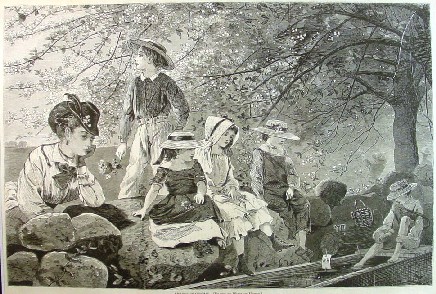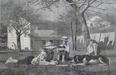 That is one of the reasons these prints have found their place in the History Gallery. Another is that they are lovely engravings many of which capture the bucolic ambiance of bygone days and are relaxing and pleasing to contemplate. This web page and the next page provide examples of Homer's original genre wood engravings from Harper's Weekly and the third page contains Homer's rare 1870 and 1871 engravings from Every Saturday. The final page contains his Civil War engravings from the battle and home fronts. A few of the engravings have been framed, as shown below, and most of the remainder have been matted to standard frame size (16 x 20 inches or 11 x 14 inches) so they can be easily and inexpensively framed, and are protected by protective plastic sleeves. Click on the pictures or titles of the wood engravings and it will take you to a page with greater details and price. Winslow Homer's Famous Double Page "Snap-the-Whip"